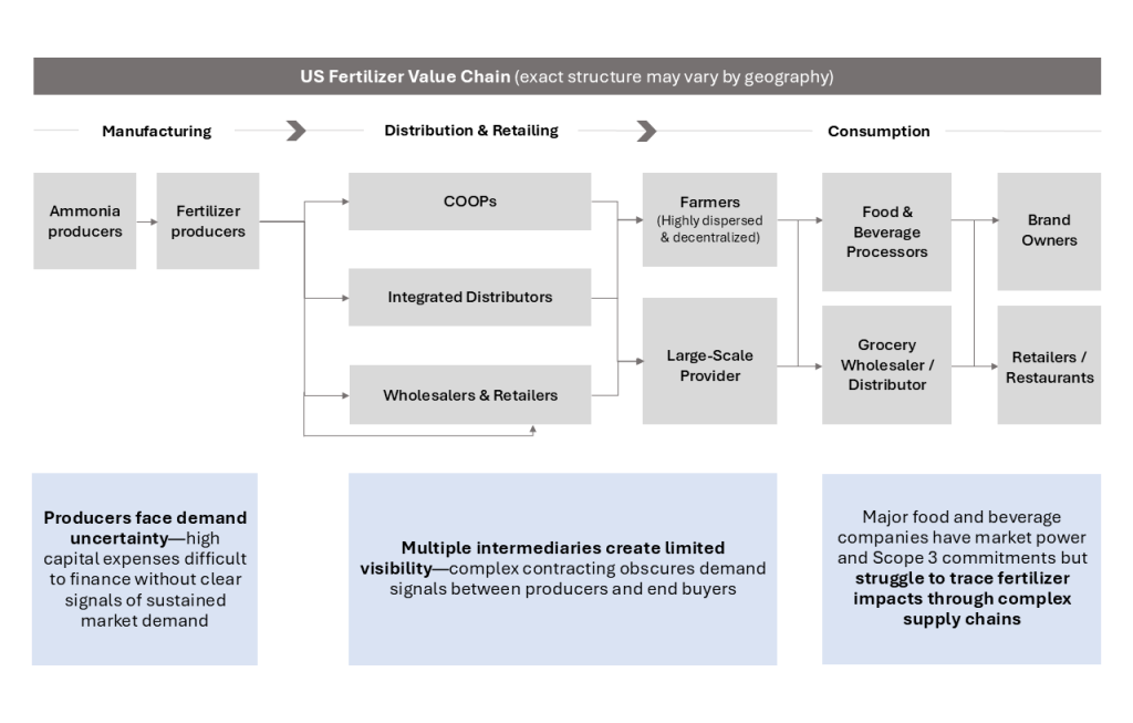 The challenge is that these corporate buyers sit 5-6 steps in the supply chain away from fertilizer manufacturers and have no established mechanism to directly procure or contract for low-emissions fertilizer (Exhibit 1). This long and often fragmented value chain prevents fertilizer producers from monetizing low-emissions production because they lack a relationship with the parties that most value decarbonization.