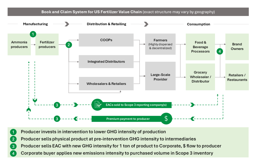 Book and claim systems solve this challenge by decoupling environmental attributes from physical product flow. Under this framework, fertilizer producers generate Environmental Attribute Certificates (EACs) for each unit of low-emission production, which are then sold separately from the physical fertilizer itself (Exhibit 2). Corporate buyers purchase these certificates to demonstrate verified emissions reductions in their Scope 3 inventories, creating a direct financial channel between producers and corporate buyers — regardless of where the physical fertilizer ultimately flows through agricultural supply chains. This structure enables revenue to reach decarbonization projects without requiring companies to engage in complex coordination that alters how farmers source inputs or require that physical molecules are traced all the way through complex value chains.
