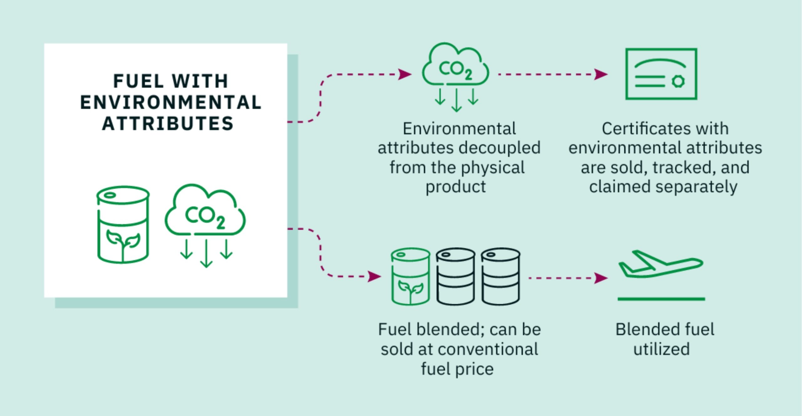 Book and claim is a chain of custody model that separates the physical fuel from its environmental attributes. It allows buyers to support SAF production even if they can’t access the fuel directly on the planes they fly on. A SAF certificate (SAFc) is created when a SAF producer generates fuel and “books” its environmental benefits into a registry. A buyer then “claims” those benefits by purchasing a SAFc. The registry ensures traceability, transparency, and prevents double counting.